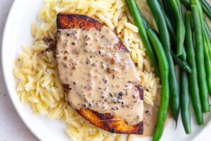 Plate the tofu “steaks” over a bed of orzo, rice, or mashed potatoes, spoon the peppercorn sauce generously over top, and serve with a side of green beans or roasted vegetables.