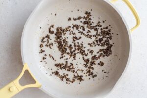 In the same skillet, add olive oil, crushed peppercorns, and shallot. Cook for about 3 minutes, stirring frequently, until fragrant.