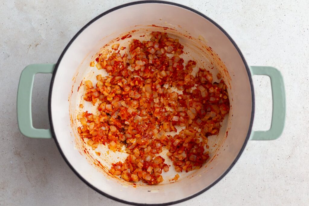 Sprinkle in the flour and stir constantly for about a minute. Mix in the tomato paste and let it cook briefly to deepen its flavor.