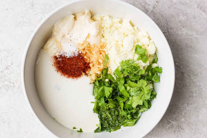 • Mix the topping sauce by stirring together the Mexican Sour Cream, mayonnaise, cotija cheese, garlic, lime zest and juice, and cilantro.